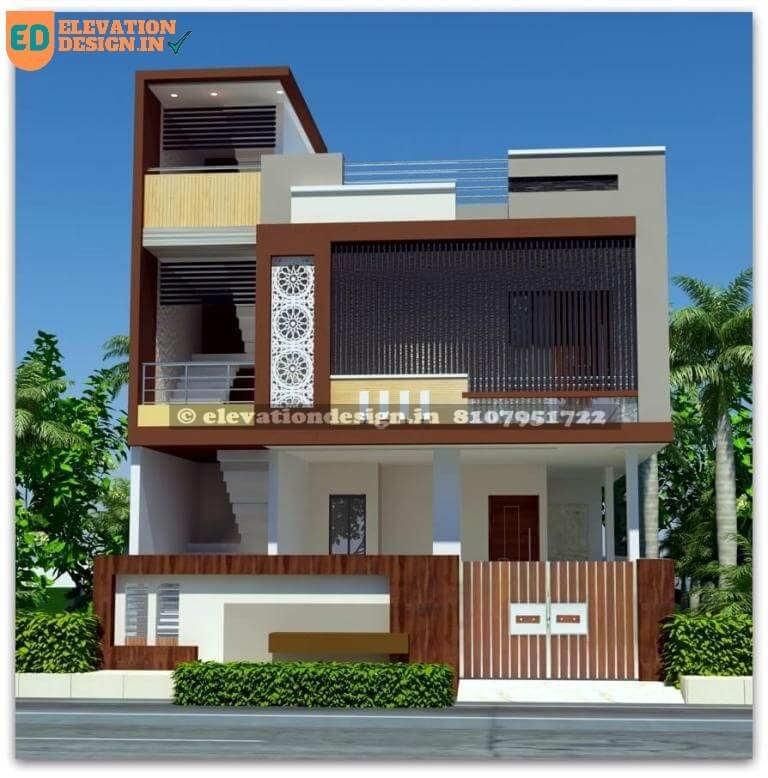 Tags: Balcony railing design, compound wall design, contemporary Indian home, exterior house design, front elevation design, Home exterior colors, HPL cladding designs, Indian architect ideas, Indian house plans, Jaali work architecture, Minimalist house design, modern home design, Residential building plans, Small plot house design