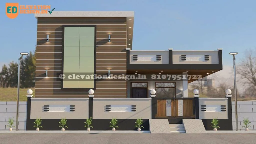 25×40 ft, 1000 sqft village single floor home front design Look at the single floor structure here. We have used texture paint on the walls. The ground floor features MS jaali for the main gate, providing privacy. Up top, you can see the horizontal MS railing and HPL paneling. The design balances open and closed elements, giving a modern yet functional street presence. We’ve also included some wood finish cladding.